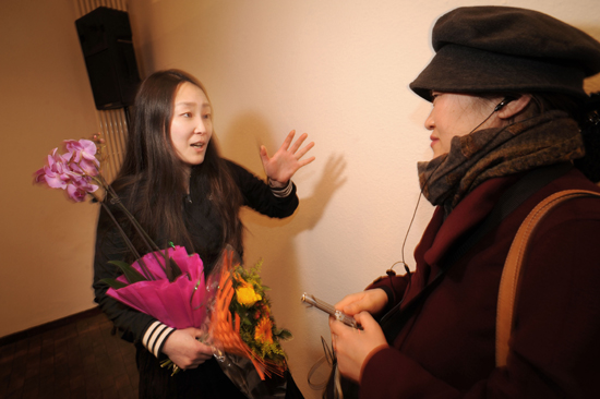 Ankabuta nimmt von einer koreanischen Journalistin aus Frankfurt Glückwünsche zur Eröffnung der ersten Einzelausstellung in Deutschland entgegen. Foto: Marcus Kaufhold © Institut Mathildenhöhe Darmstadt