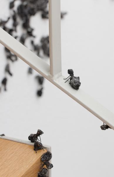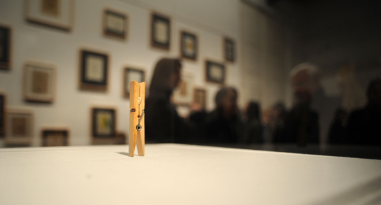Eine Skulptur Ankabutas aus einer Wäscheklammer und etwas Ton trifft auf erste Vernissagebesucher. Foto: Marcus Kaufhold © Institut Mathildenhöhe Darmstadt