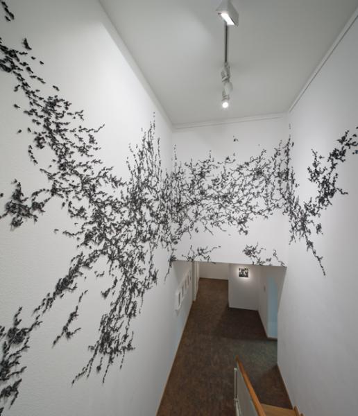 Tausende von Ameisen krabbeln auf dem Boden, klettern an Wänden hoch und erobern den Ausstellungsraum. Ein winziger Kopf ist in der Aussparung einer Wäscheklammer gefangen. Ein Bleistift gefährdet mit seiner scharfen Spitze damoklesartig das winzige Wesen im Bett. Und von einer raumfüllenden Stickarbeit in transparenter Plastikfolie hängen kleine Nadeln wie winzige Stalaktiten herunter und schaffen ein Gefühl latenter Bedrohung. Die südkoreanische Künstlerin Songie Seuk alias Ankabuta verwebt große und kleine Gedanken, zeitaufwendige Werke und Minuten-Arbeiten zu einem spannungsreichen Beziehungsnetz, das mit hochemotionalen Botschaften überrascht. Im Zentrum dieses Netzes steht immer die Künstlerin selbst mit ihrem überaus sprechenden Künstlernamen: Denn Ankabuta bedeutet in der arabischen Sprache „weibliche Spinne“.