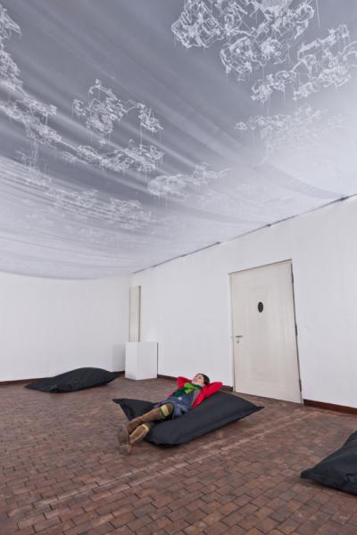Die Künstlerin und der Kurator machen es den Besuchern vor - aus den Kissen wandern ihre Blicke gemeinsam in Ankabutas Himmel - der Deckearbeit 7815+. Foto: Marcus Kaufhold © Institut Mathildenhöhe Darmstadt